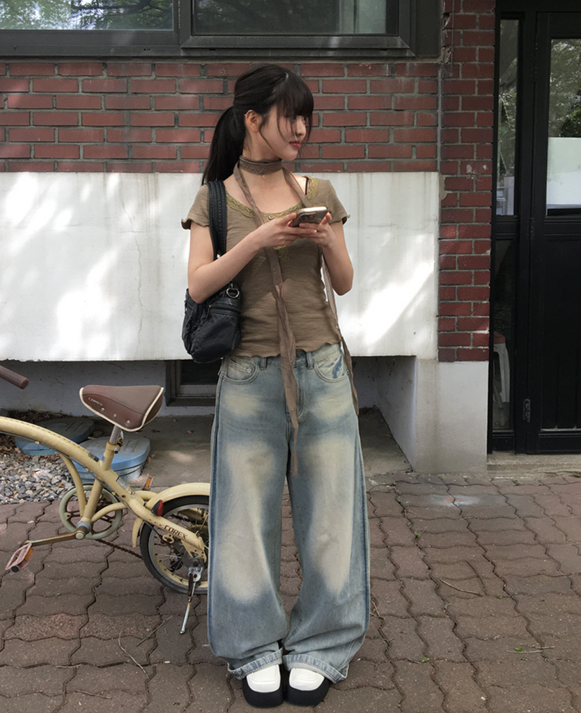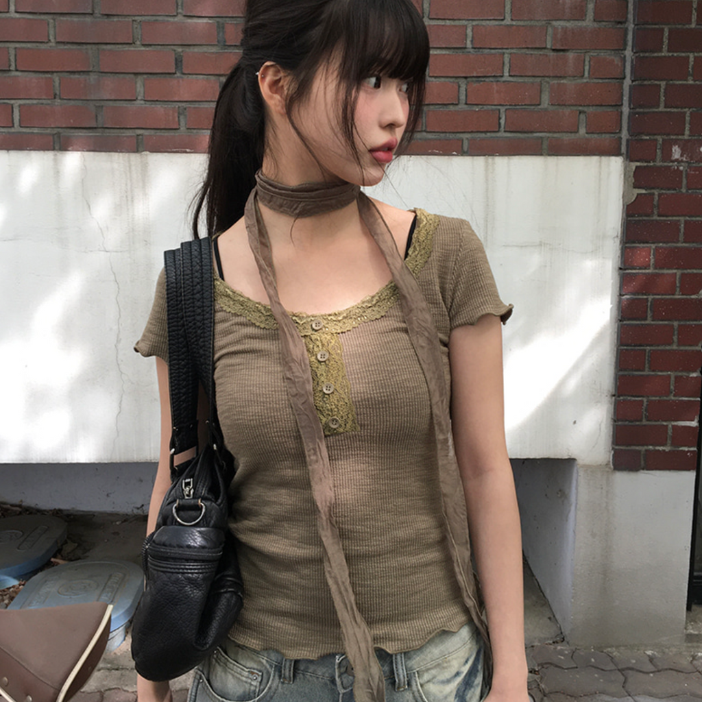 [anyonemore] Suki Lace Button Choker Short Sleeve T-Shirt Set