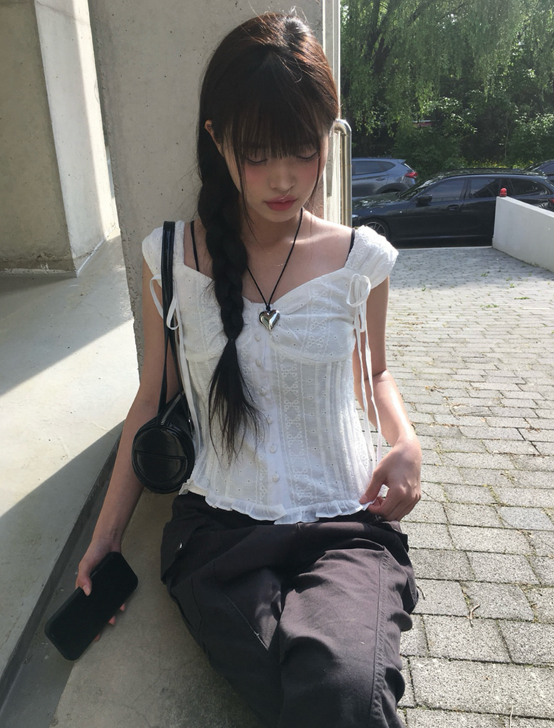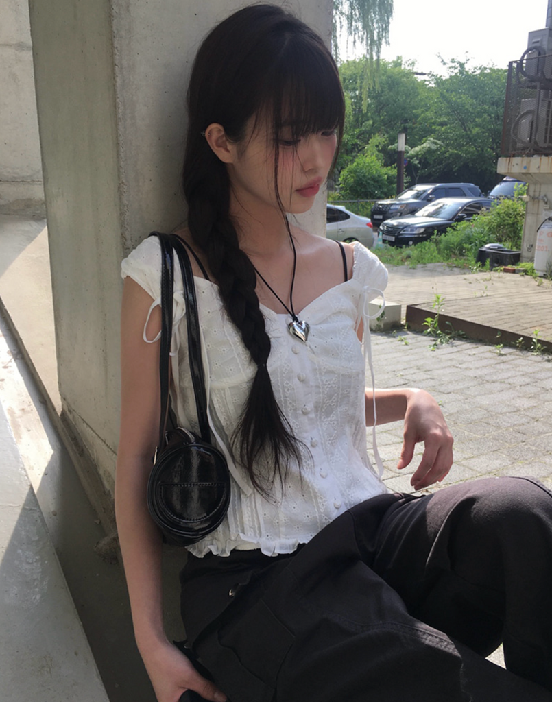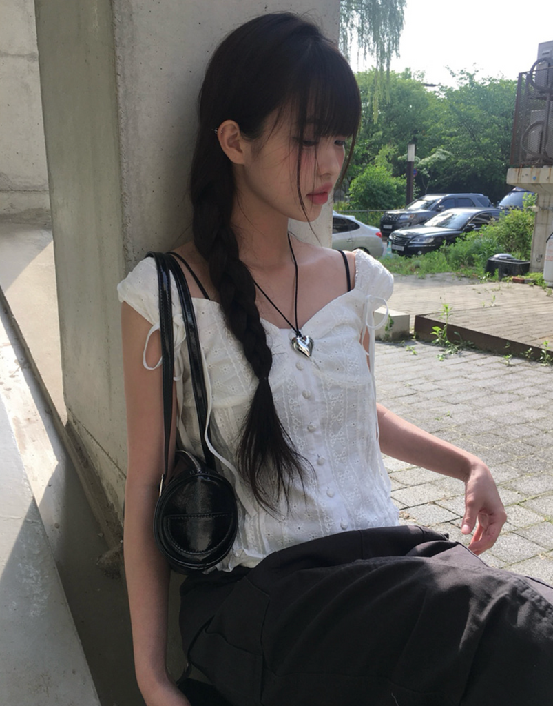 [anyonemore] Summer Ribbon Strap Pintuck Puff Short Sleeved Blouse