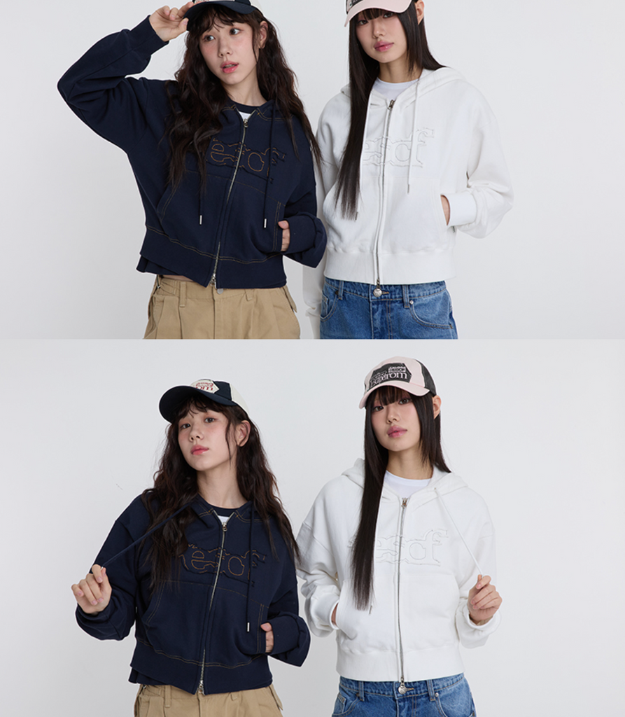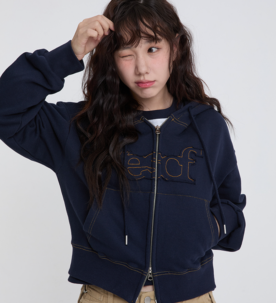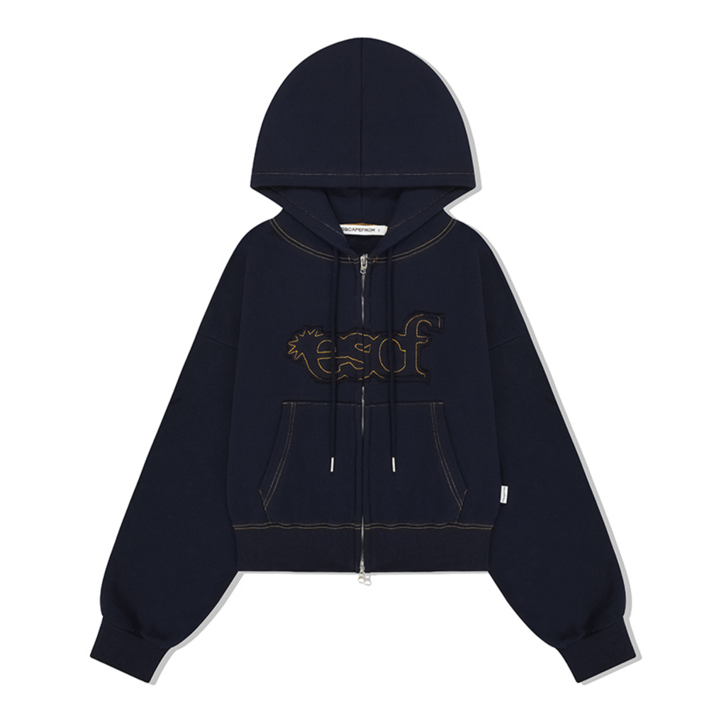 [ESCAPEFROM] Flare Type Logo Applique Cropped Hooded Zip-Up Navy