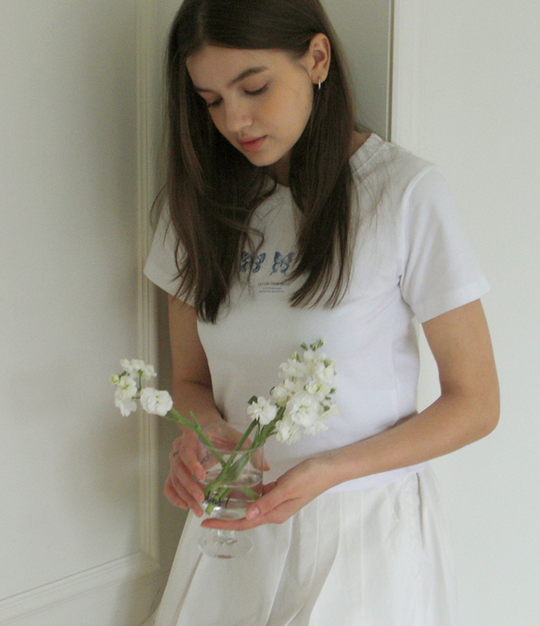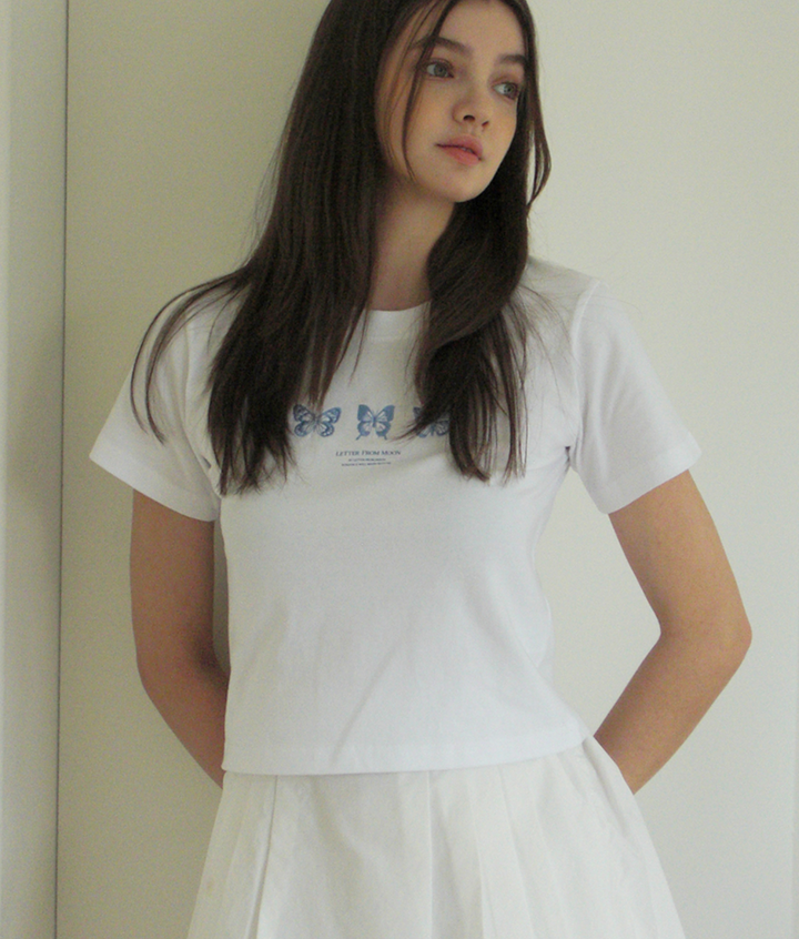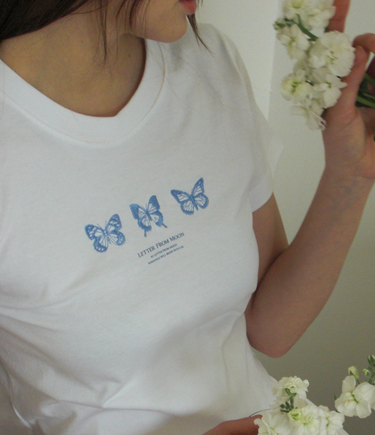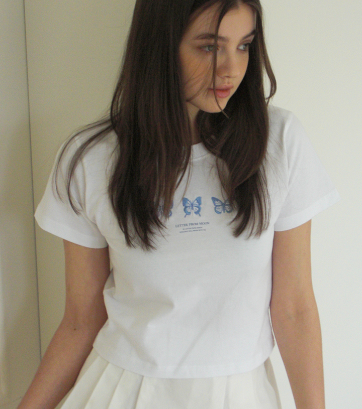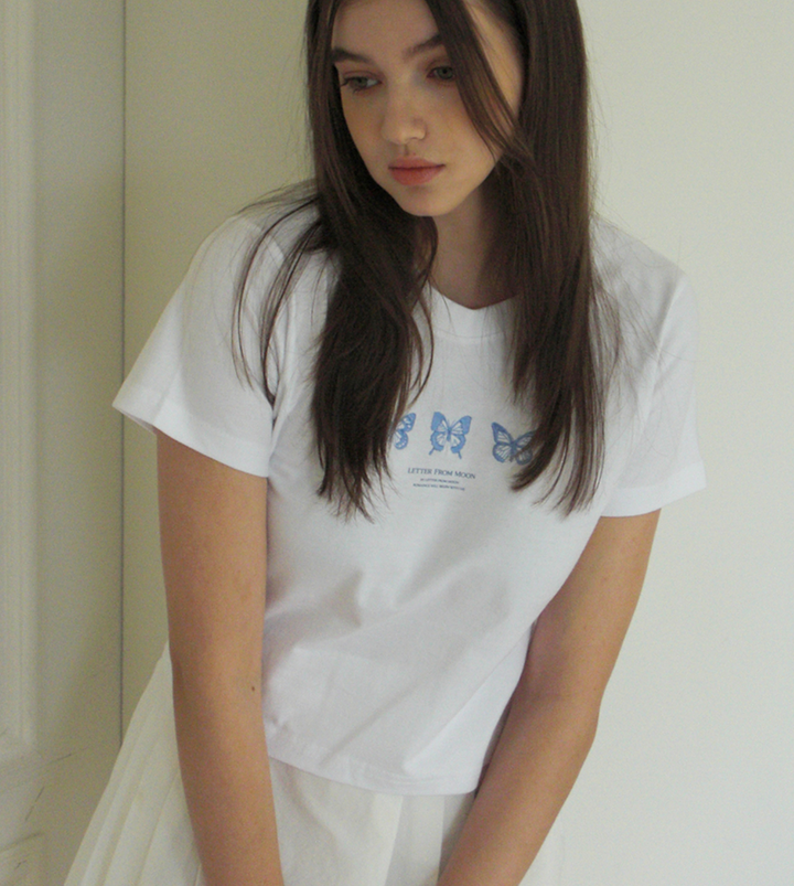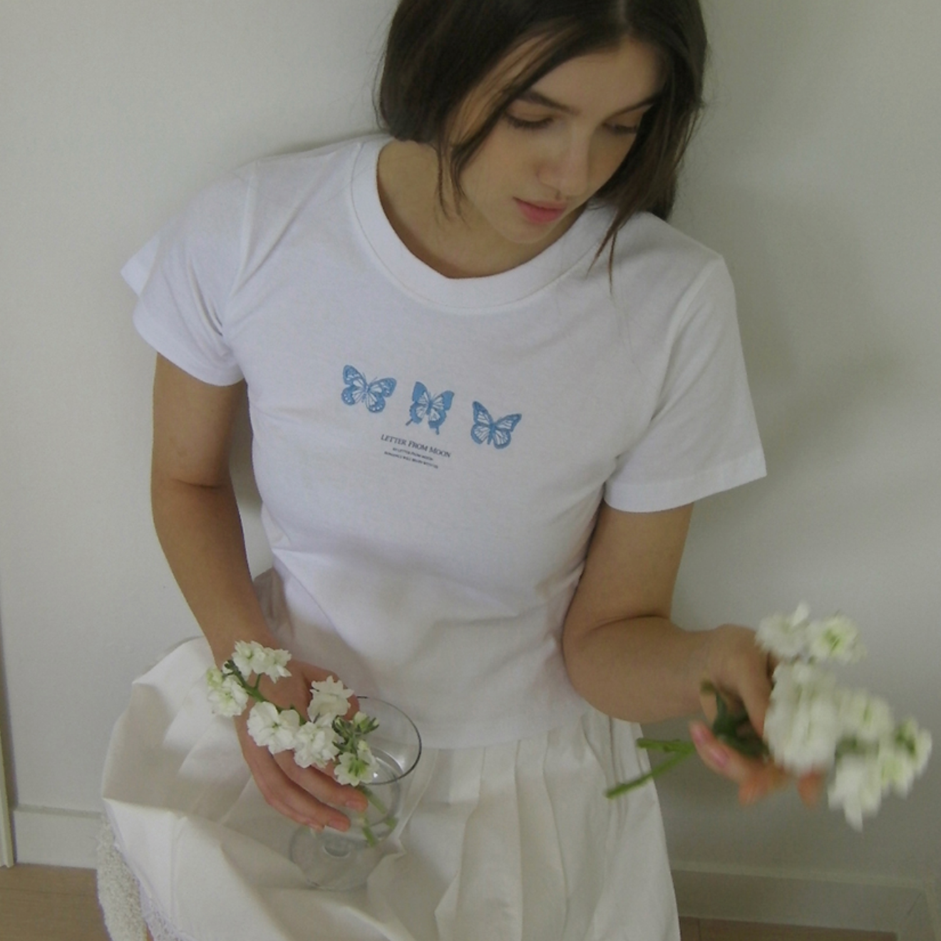 [Letter from Moon] Triple Butterfly Crop Short Sleeve T-shirts (White & Blue)