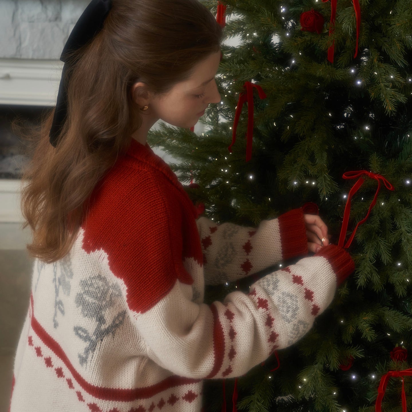 [Letter from Moon][Holiday Edition] Rose Flower Jacquard Knit Wool Zip-Up ( Red )